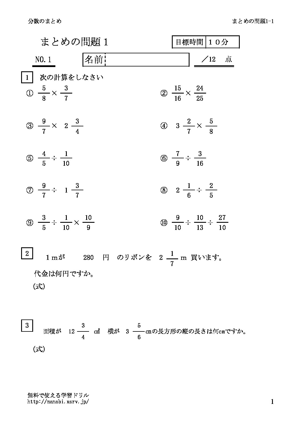 分数のかけ算・わり算 分数のかけ算、わり算のまとめ 分数のかけ算わり算の計算、文章題の問題です。テスト対策やまとめ学習にご利用ください。学習のポイント基本的な計算のやり方をしっかり確認してください。ミスしやすい部分を自分で見つけるようにしましょう。分数のかけ算、わり算の問題はこちら分数のかけ... 2015.08.14 2025.10.02 分数のかけ算・わり算算数・計算6年生算数